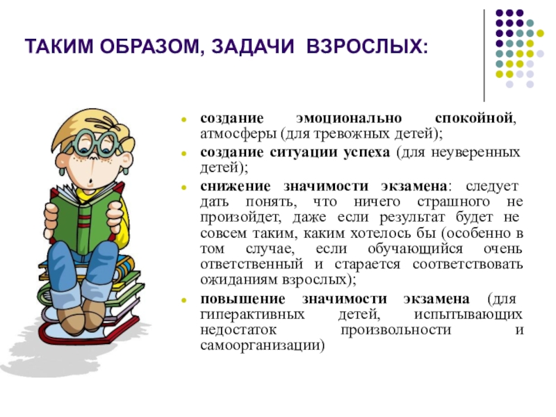 снижение значимости экзамена: следует дать понять, что ничего страшного не произойдет, даже если результат будет не совсем таким, каким хотелось бы (особенно в том случае, если обучающийся очень ответственный и старается соответствовать ожиданиям взрослых);