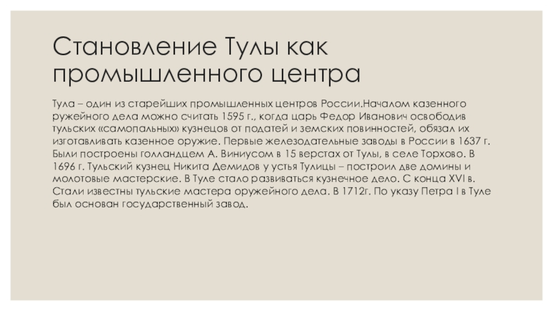 Становление Тулы как промышленного центраТула – один из старейших промышленных центров России.Началом казенного ружейного дела можно считать