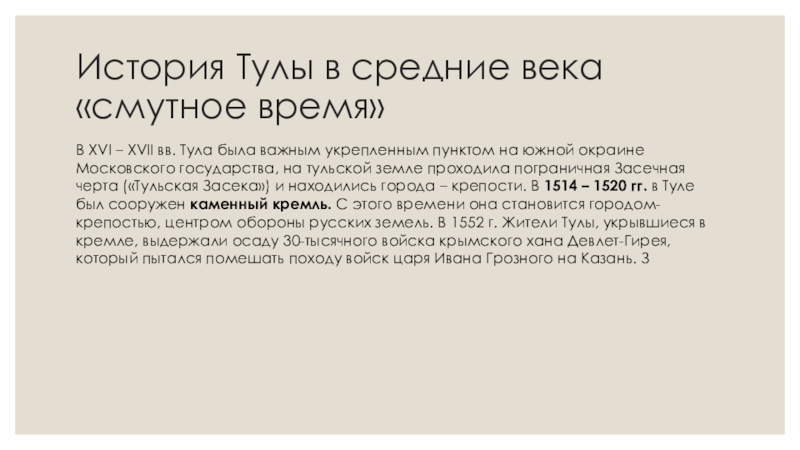Тула была важным укрепленным пунктом на южной окраине Московского государства, на тульской земле проходила пограничная Засечная черта («Тульская Засека») и находились города – крепости. В 1514 – 1520 гг. в Туле был сооружен каменный кремль. С этого времени она становится городом-крепостью, центром обороны русских земель. В 1552 г. Жители Тулы, укрывшиеся в кремле, выдержали осаду 30-тысячного войска крымского хана Девлет-Гирея, который пытался помешать походу войск царя Ивана Грозного на Казань. З