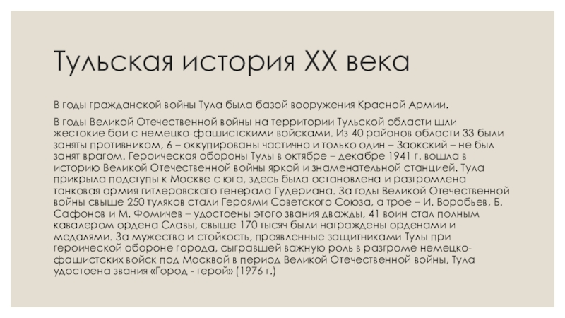 Тульская история ХХ векаВ годы гражданской войны Тула была базой вооружения Красной Армии.В годы Великой Отечественной войны