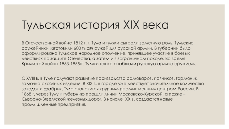 Тульская история XIX векаВ Отечественной войне 1812 г. г. Тула и туляки сыграли заметную роль. Тульские оружейники