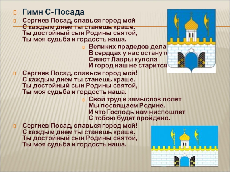 Гимн С-ПосадаСергиев Посад, славься город мой С каждым днем ты станешь краше.  Ты достойный сын Родины