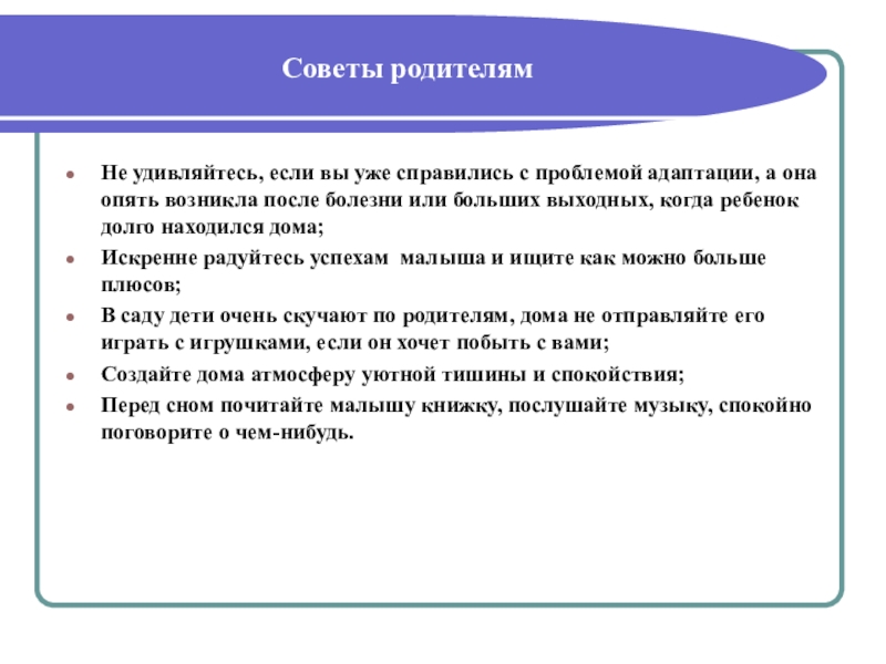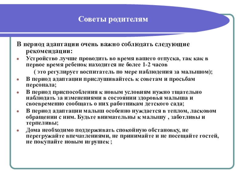 В период адаптации малыш особенно нуждается в теплом, ласковом обращении с ним. Будьте внимательны к малышу , заботливы и терпеливы;