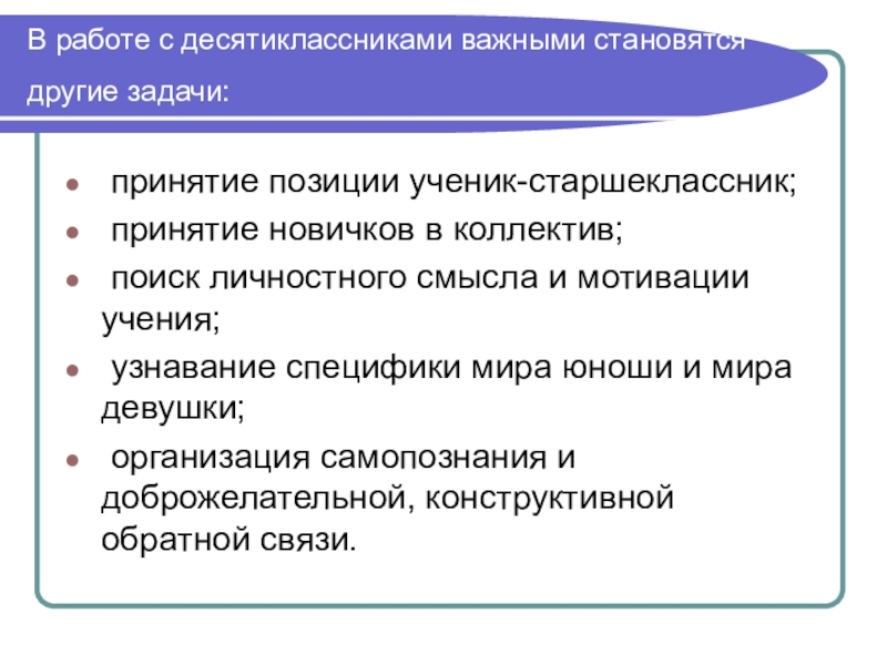 Слайд 9В работе с десятиклассниками важными становятся другие задачи: