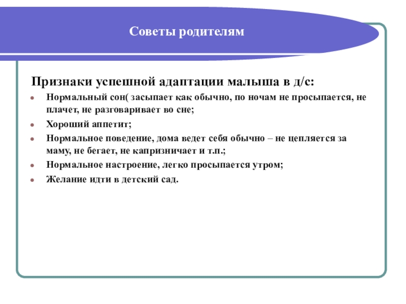 Нормальное поведение, дома ведет себя обычно – не цепляется за маму, не бегает, не капризничает и т.п.;