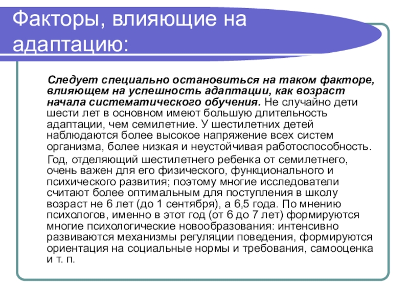 факторе, влияющем на успешность адаптации, как возраст начала систематического обучения. Не случайно дети шести лет в основном имеют большую длительность адаптации, чем семилетние. У шестилетних детей наблюдаются более высокое напряжение всех систем организма, более низкая и неустойчивая работоспособность.