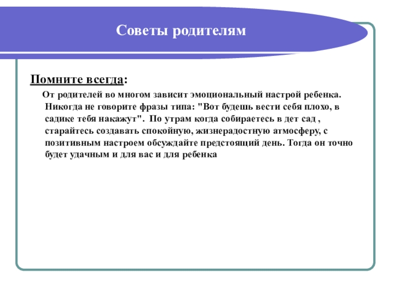 эмоциональный настрой ребенка. Никогда не говорите фразы типа: "Вот будешь вести себя плохо, в садике тебя накажут". По утрам когда собираетесь в дет сад , старайтесь создавать спокойную, жизнерадостную атмосферу, с позитивным настроем обсуждайте предстоящий день. Тогда он точно будет удачным и для вас и для ребенка