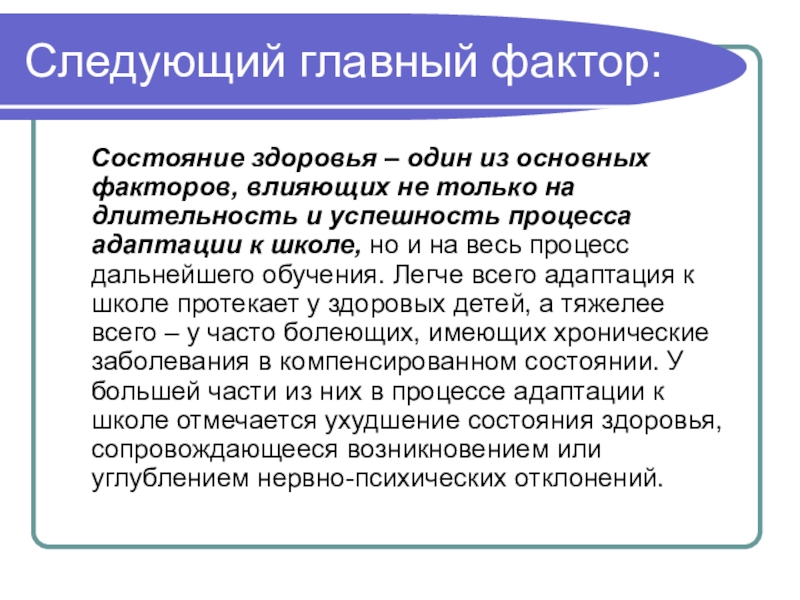 влияющих не только на длительность и успешность процесса адаптации к школе, но и на весь процесс дальнейшего обучения. Легче всего адаптация к школе протекает у здоровых детей, а тяжелее всего – у часто болеющих, имеющих хронические заболевания в компенсированном состоянии. У большей части из них в процессе адаптации к школе отмечается ухудшение состояния здоровья, сопровождающееся возникновением или углублением нервно-психических отклонений.