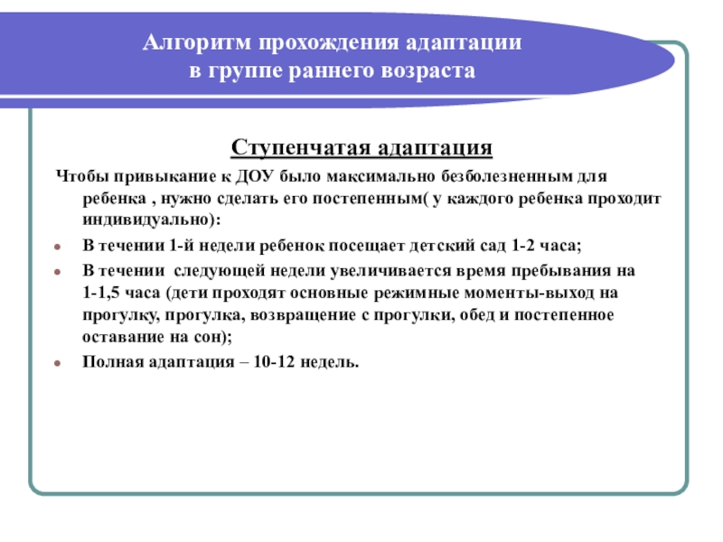 В течении следующей недели увеличивается время пребывания на 1-1,5 часа (дети проходят основные режимные моменты-выход на прогулку, прогулка, возвращение с прогулки, обед и постепенное оставание на сон);