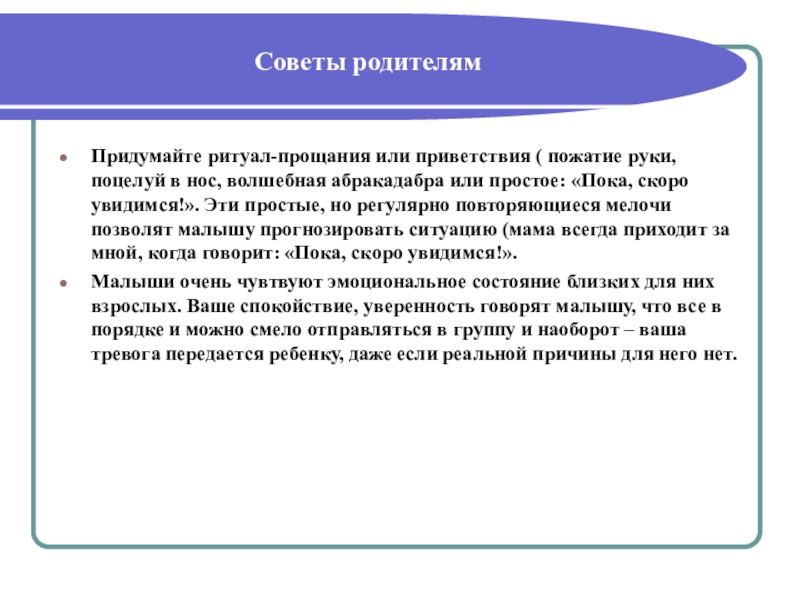 волшебная абракадабра или простое: «Пока, скоро увидимся!». Эти простые, но регулярно повторяющиеся мелочи позволят малышу прогнозировать ситуацию (мама всегда приходит за мной, когда говорит: «Пока, скоро увидимся!».