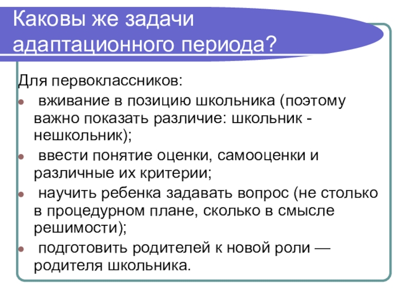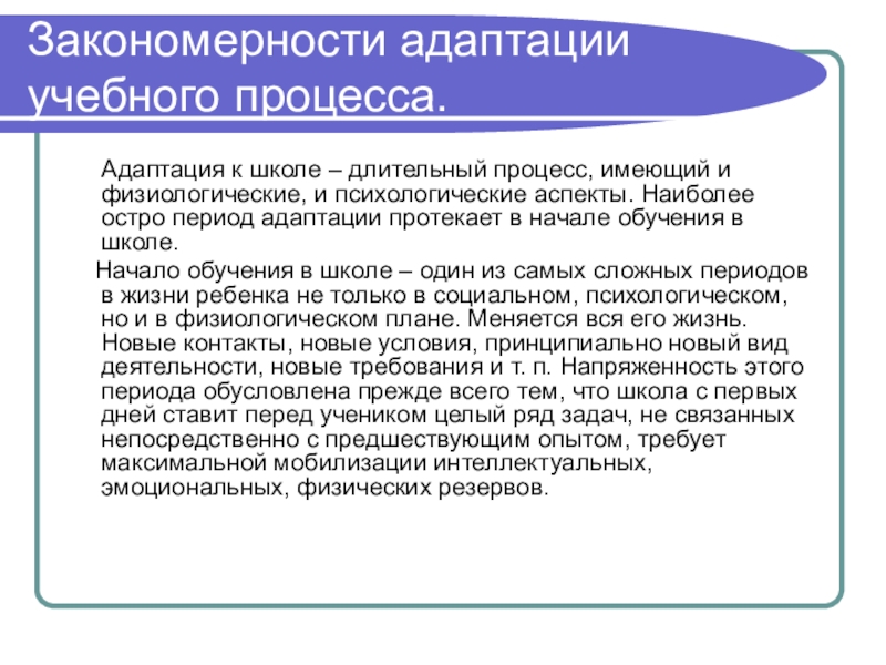 процесс, имеющий и физиологические, и психологические аспекты. Наиболее остро период адаптации протекает в начале обучения в школе.
