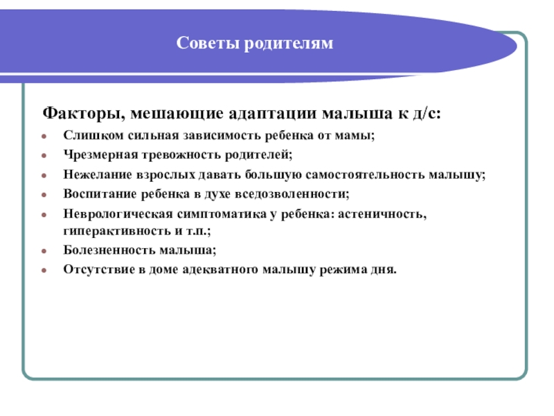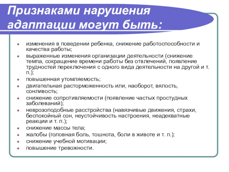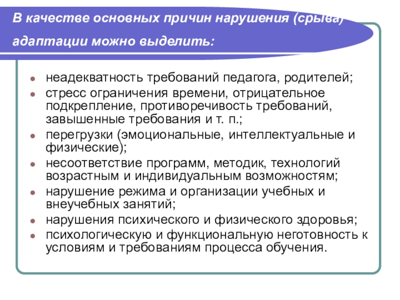 Слайд 24В качестве основных причин нарушения (срыва) адаптации можно выделить: