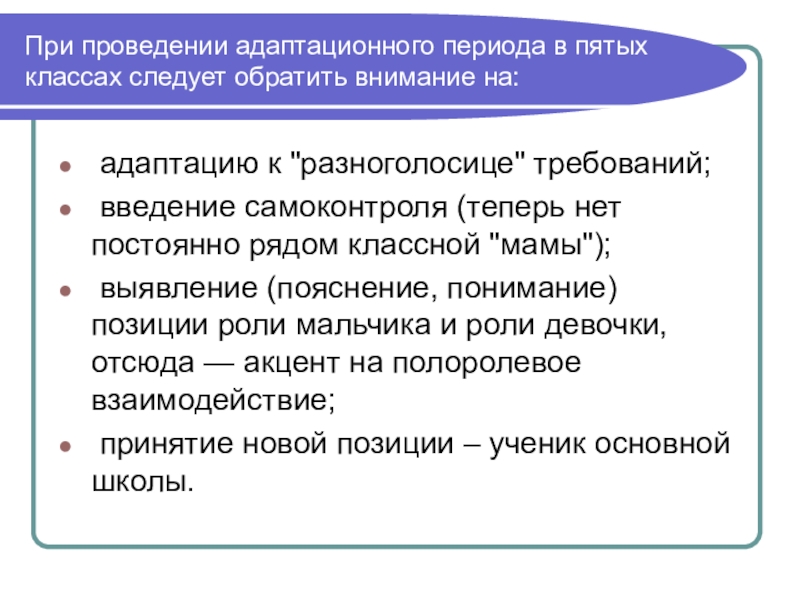Слайд 8При проведении адаптационного периода в пятых классах следует обратить внимание на: