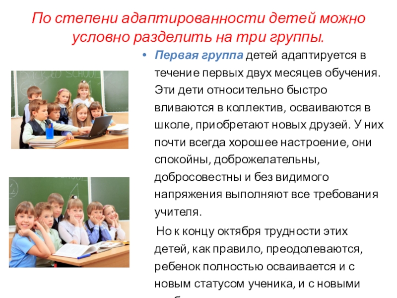 детей адаптируется в течение первых двух месяцев обучения. Эти дети относительно быстро вливаются в коллектив, осваиваются в школе, приобретают новых друзей. У них почти всегда хорошее настроение, они спокойны, доброжелательны, добросовестны и без видимого напряжения выполняют все требования учителя.