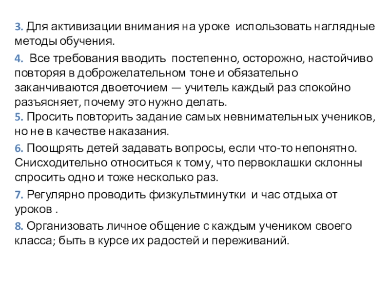 Все требования вводить постепенно, осторожно, настойчиво повторяя в доброжелательном тоне и обязательно заканчиваются двоеточием — учитель каждый раз спокойно разъясняет, почему это нужно делать.
