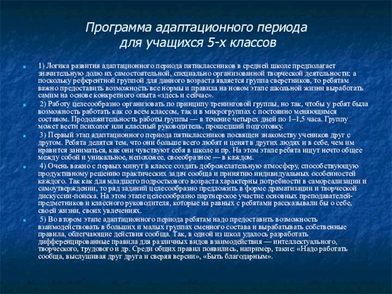 3) Первый этап адаптационного периода пятиклассников посвящен знакомству учеников друг с другом. Ребята делятся тем, что они больше всего любят и ценят в других людях и в себе, чем им нравится заниматься, как они чувствуют себя в школе и пр. На этом этапе ребята ищут нечто общее между собой и уникальное, непохожее, своеобразное — в каждом.