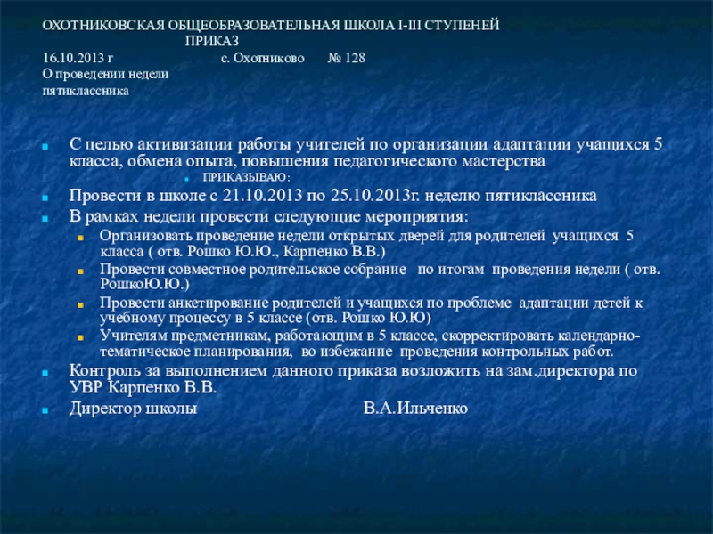 Провести в школе с 21.10.2013 по 25.10.2013г. неделю пятиклассника
