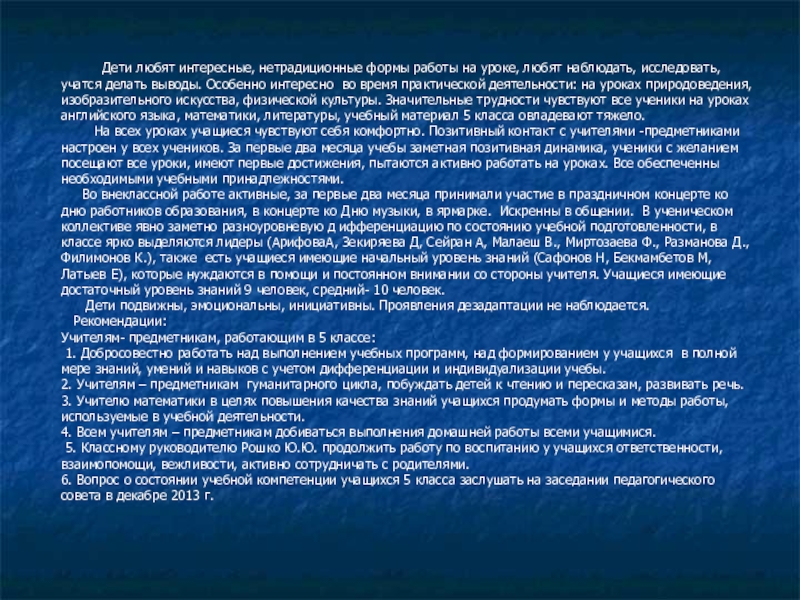 Учебный материал 5 класса овладевают на достаточном уровне, явных проявлений дезадаптации не наблюдается. Три ученика Сафонов Н., Бекмамбетов М., Латыев Е . имеют низкий уровень знаний, но по итогам 4 класса – средний уровень знаний, на уроках нуждаются в систематической индивидуальной работе, не всегда выполняют домашние задания, учебный материал овладевают, но нуждаются в постоянной помощи со стороны учителя. 13 % учеников работают в тетрадях неряшливо, делают исправления, нарушают каллиграфические требования, во время письма невнимательные, что негативно влияет на результат. Навык чтения при выполнении технической нормы слов полностью сформирован у 63% учащихся. На уроках естественно-математического цикла ученики также обнаруживают разный уровень знаний и учебную мотивацию в частности, на уроках математики 35% учащихся имеют слабые знания, также есть учащиеся, которые плохо знают таблицы умножения. Вычислительные навыки сформированы, но часто дети невнимательные, делают механические ошибки, которые могут исправить, если за указанием учителя внимательно проверят работу.