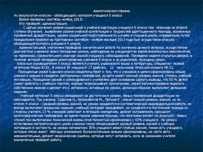 С целью изучения уровня социальной и учебной адаптации учащихся 5 класса при переходе ко второй ступени обучения, выявление уровня учебной компетенции и трудностей адаптационного периода, возможных проявлений дезадаптации, уровня социальной подготовленности к учебе в старшей школе, определение путей преодоления проблем на протяжении сентября - ноября месяцев 2013 года был осуществлен классно - обобщающий контроль учащихся 5 класса.