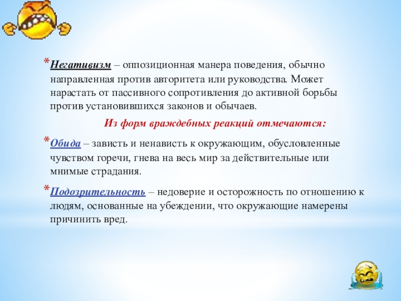 Слайд 7Негативизм – оппозиционная манера поведения, обычно направленная против авторитета или руководства.
