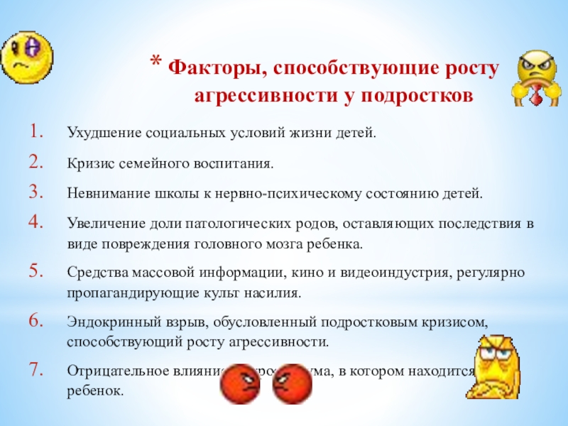 Слайд 3Факторы, способствующие росту агрессивности у подростков