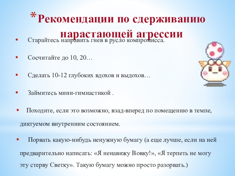 Слайд 12Рекомендации по сдерживанию нарастающей агрессии
