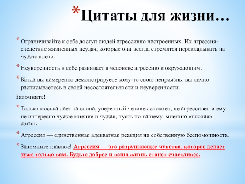 Запомните главное! Агрессия — это разрушающее чувство, которое делает хуже только вам. Будьте добрее и ваша жизнь станет счастливее.