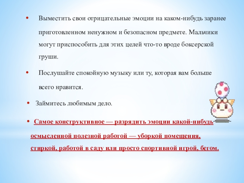 Слайд 13Выместить свои отрицательные эмоции на каком-нибудь заранее приготовленном ненужном и безопасном