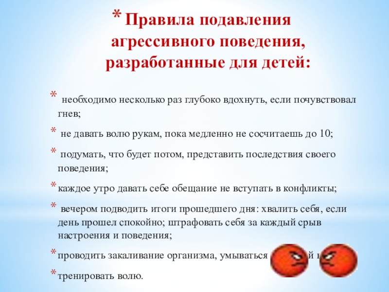 Слайд 11Правила подавления агрессивного поведения, разработанные для детей: