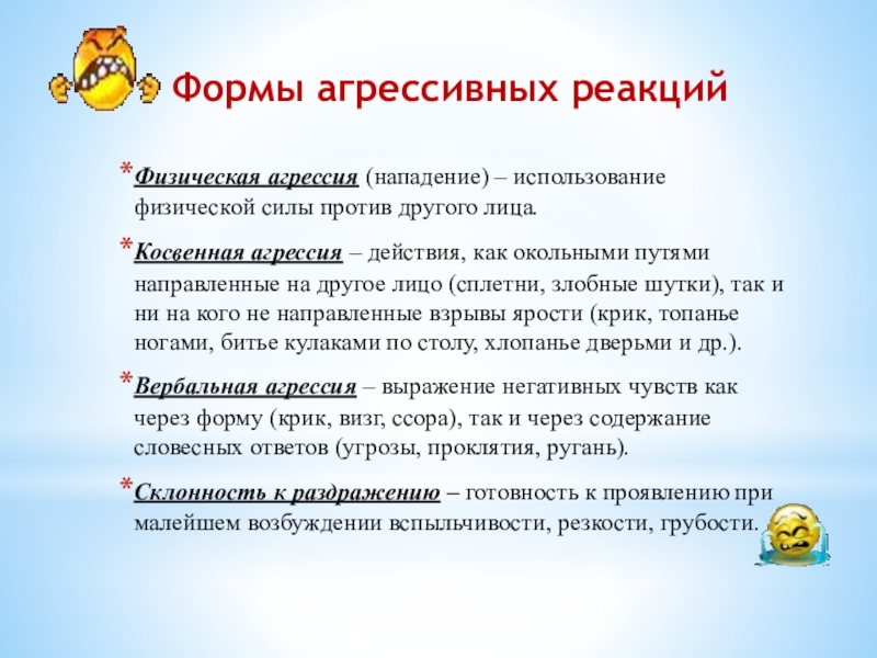 Вербальная агрессия – выражение негативных чувств как через форму (крик, визг, ссора), так и через содержание словесных ответов (угрозы, проклятия, ругань).