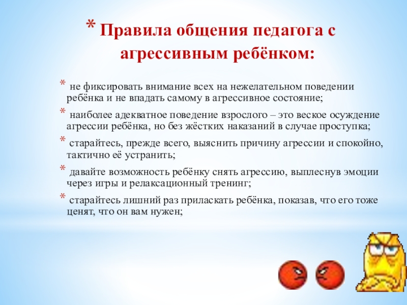 Слайд 9Правила общения педагога с агрессивным ребёнком: