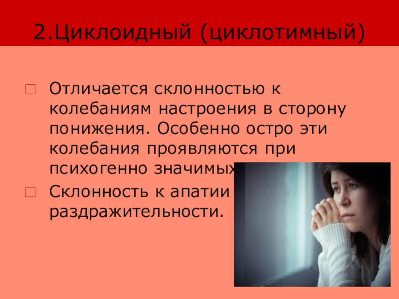2.Циклоидный (циклотимный)Отличается склонностью к колебаниям настроения в сторону понижения. Особенно остро эти колебания проявляются при психогенно значимых