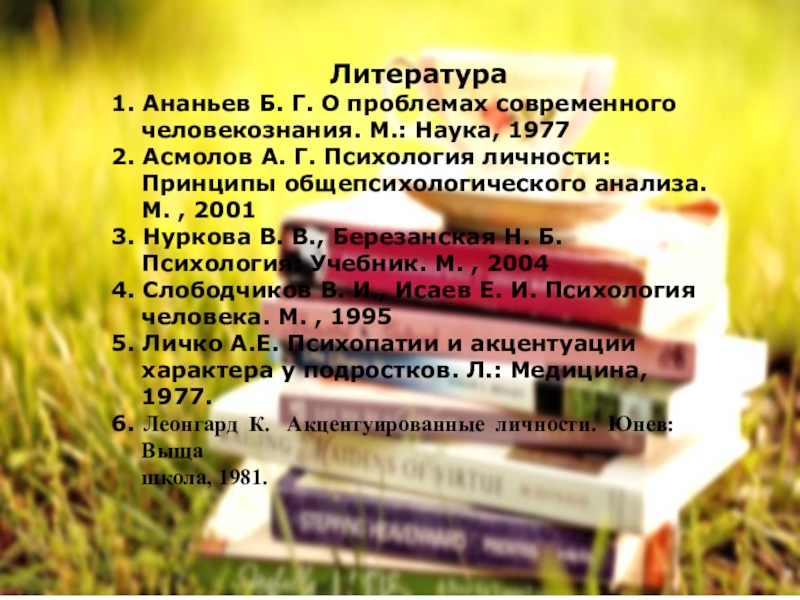 Литература1. Ананьев Б. Г. О проблемах современного человекознания. М.: Наука, 19772. Асмолов А. Г. Психология личности: Принципы