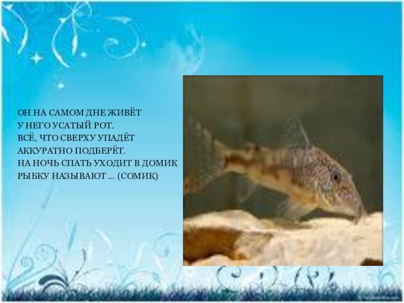 ОН НА САМОМ ДНЕ ЖИВЁТУ НЕГО УСАТЫЙ РОТ.ВСЁ, ЧТО СВЕРХУ УПАДЁТАККУРАТНО ПОДБЕРЁТ.НА НОЧЬ СПАТЬ УХОДИТ В ДОМИКРЫБКУ