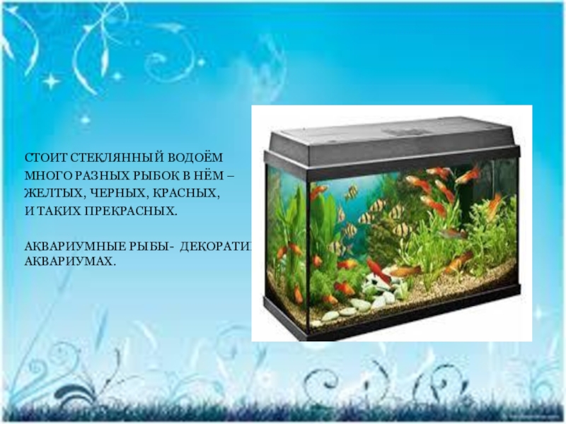 СТОИТ СТЕКЛЯННЫЙ ВОДОЁММНОГО РАЗНЫХ РЫБОК В НЁМ –ЖЕЛТЫХ, ЧЕРНЫХ, КРАСНЫХ,И ТАКИХ ПРЕКРАСНЫХ.АКВАРИУМНЫЕ РЫБЫ- ДЕКОРАТИВНЫЕ РЫБЫ, КОТОРЫХ СОДЕРЖАТ В АКВАРИУМАХ.