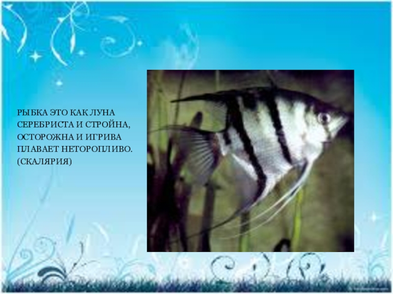 РЫБКА ЭТО КАК ЛУНАСЕРЕБРИСТА И СТРОЙНА,ОСТОРОЖНА И ИГРИВАПЛАВАЕТ НЕТОРОПЛИВО.(СКАЛЯРИЯ)