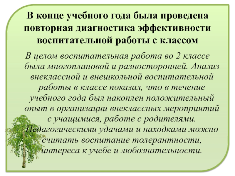 В целом воспитательная работа во 2 классе была многоплановой и разносторонней. Анализ внеклассной и внешкольной воспитательной работы в классе показал, что в течение учебного года был накоплен положительный опыт в организации внеклассных мероприятий с учащимися, работе с родителями. Педагогическими удачами и находками можно считать воспитание толерантности, интереса к учебе и любознательности.