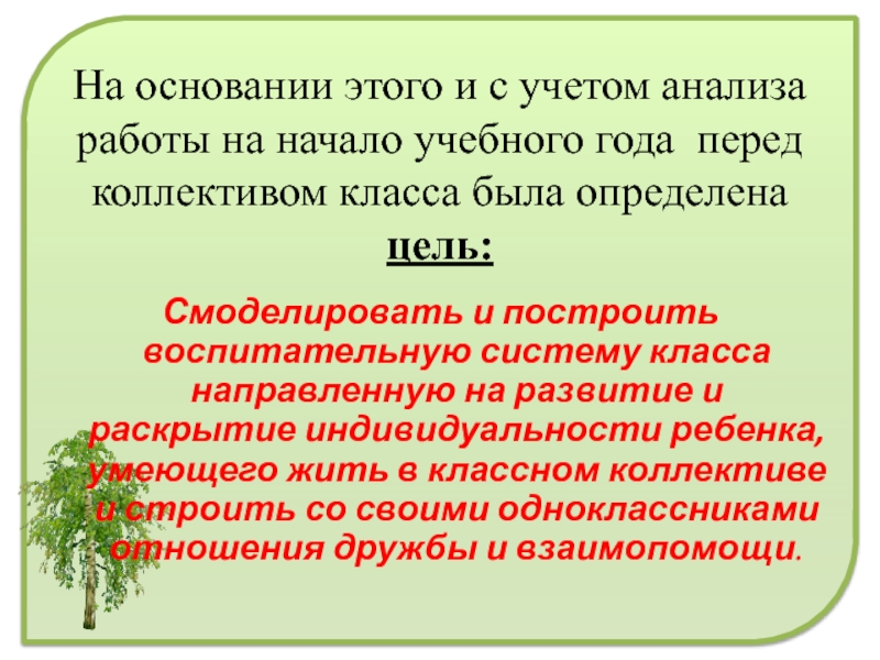Смоделировать и построить воспитательную систему класса направленную на развитие и раскрытие индивидуальности ребенка, умеющего жить в классном коллективе и строить со своими одноклассниками отношения дружбы и взаимопомощи.