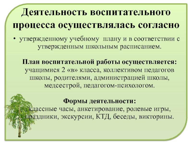 Слайд 10Деятельность воспитательного процесса осуществлялась согласно
