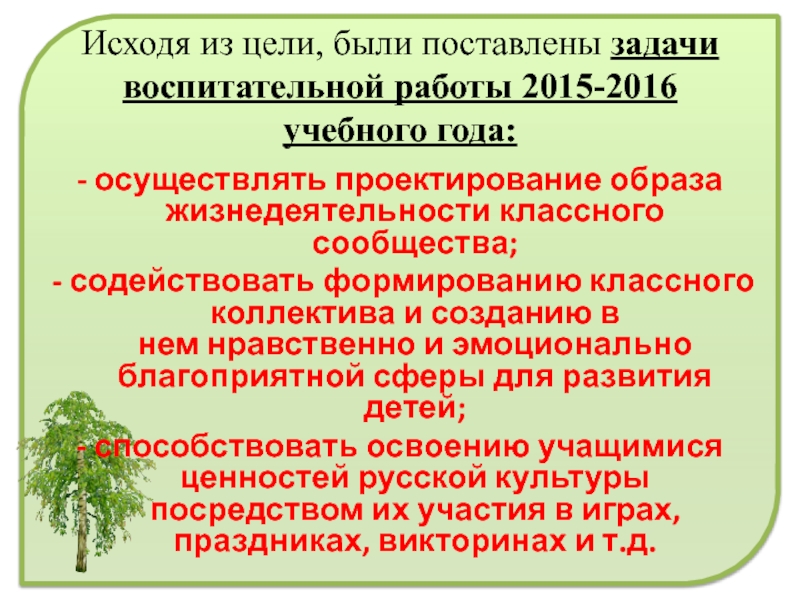 Слайд 8Исходя из цели, были поставлены задачи воспитательной работы 2015-2016 учебного года: