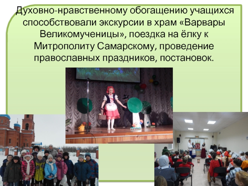 Слайд 18Духовно-нравственному обогащению учащихся способствовали экскурсии в храм «Варвары Великомученицы», поездка на