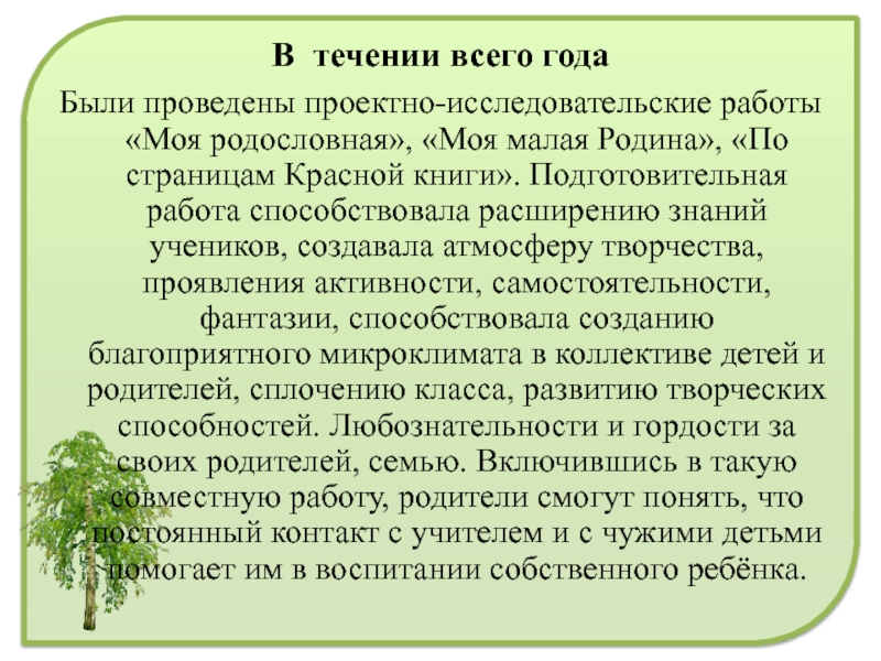 «По страницам Красной книги». Подготовительная работа способствовала расширению знаний учеников, создавала атмосферу творчества, проявления активности, самостоятельности, фантазии, способствовала созданию благоприятного микроклимата в коллективе детей и родителей, сплочению класса, развитию творческих способностей. Любознательности и гордости за своих родителей, семью. Включившись в такую совместную работу, родители смогут понять, что постоянный контакт с учителем и с чужими детьми помогает им в воспитании собственного ребёнка.
