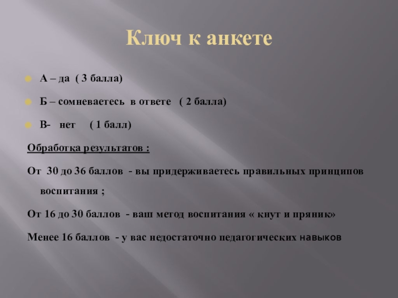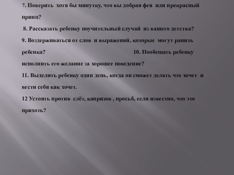 1. В любой момент оставить все свои дела и заняться ребенком? 2.Посоветоваться с ребенком несмотря на его возраст? 3. Признаться ребенку в ошибке, совершенной по отношению к нему? 4.Извиниться перед ребенком в случае ,если вы были не правы? 5. Сохранить самообладание, даже если поступок ребенка вывел вас из себя?