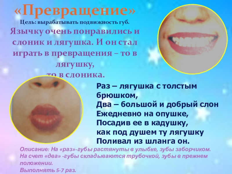 Описание : улыбнуться, открыть рот, облизать языком верхнюю, а затем нижнюю губу по кругу. Выполнять в одну, а затем в другую сторону. Повторить 4-5 раз.