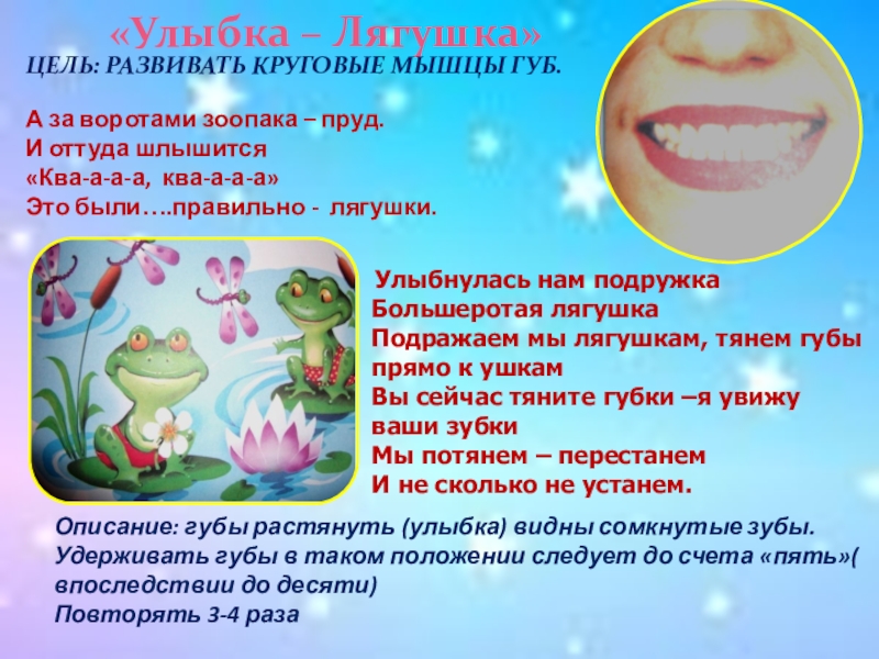 Подражаем мы лягушкам, тянем губы прямо к ушкам