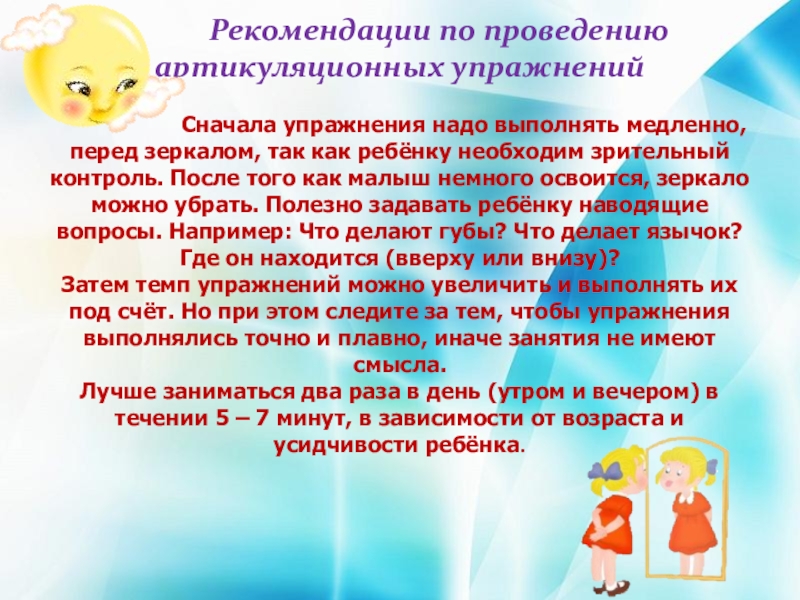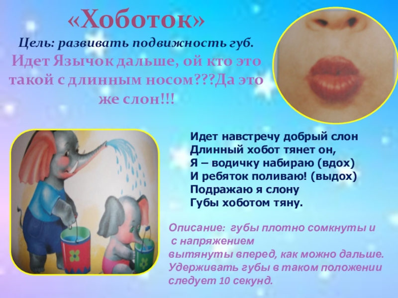 Удерживать губы в таком положении следует до счета «пять»( впоследствии до десяти)