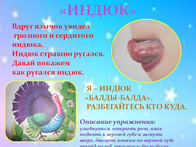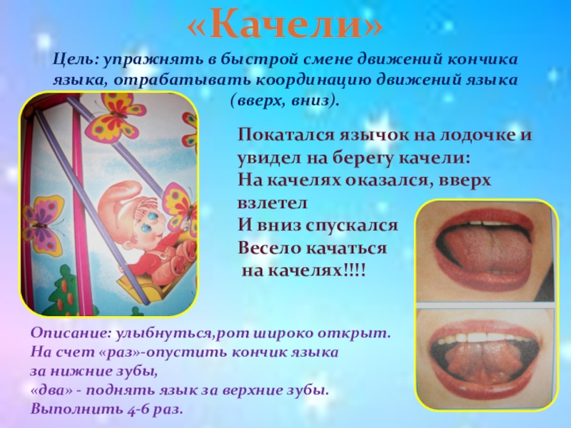 Описание упражнения: улыбнуться, открыть рот, язык поднять к верхней губе и загнуть вверх, двигать языком по верхней губе вперёд-назад, произнося: была-была-была