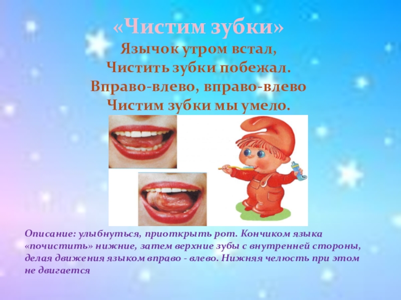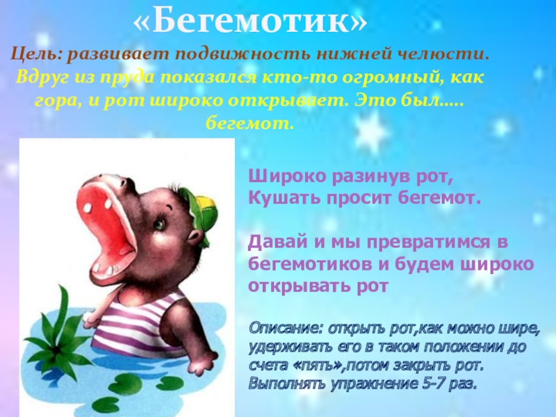 Описание: открыть рот,как можно шире,удерживать его в таком положении до счета «пять»,потом закрыть рот.