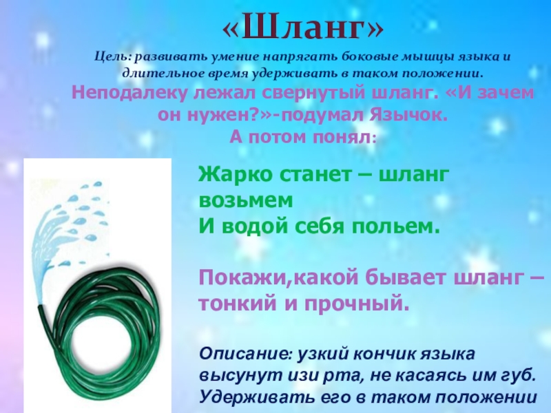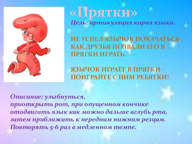 Описание: узкий кончик языка высунут изи рта, не касаясь им губ. Удерживать его в таком положении на счет