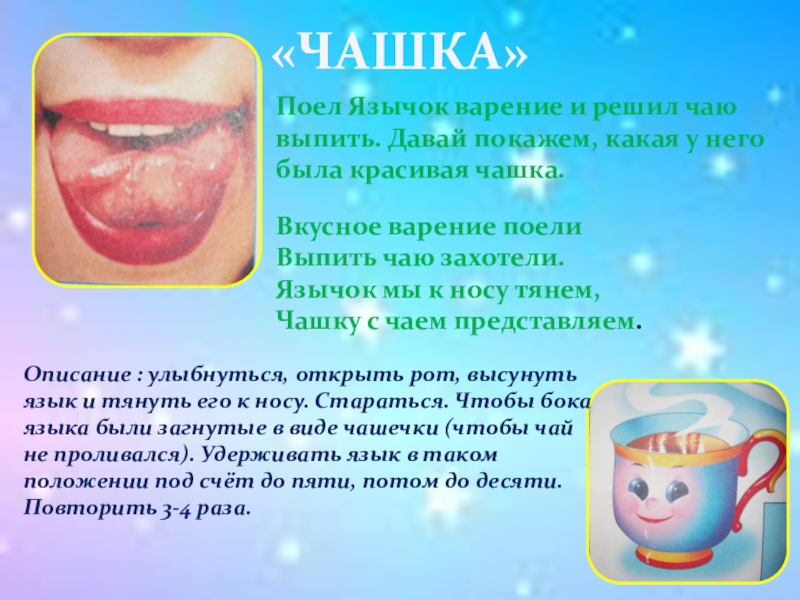 Описание : улыбнуться, открыть рот, высунуть язык и тянуть его к носу. Стараться. Чтобы бока языка были загнутые в виде чашечки (чтобы чай не проливался). Удерживать язык в таком положении под счёт до пяти, потом до десяти. Повторить 3-4 раза.